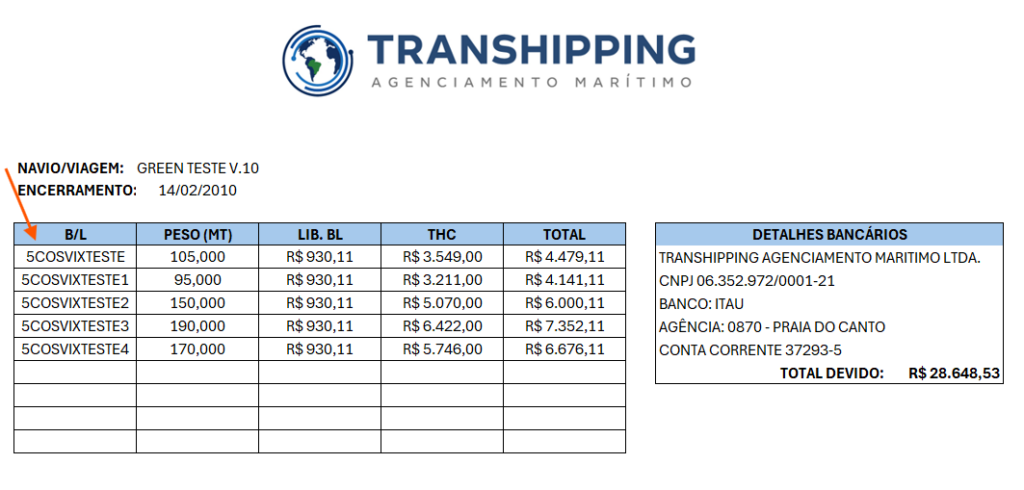 Note que, de modo que retorne todos os dados corretamente, o número do BL deve ser inserido na coluna determinada e sem qualquer espaçamento, conforme imagem abaixo: